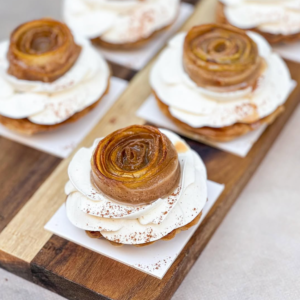 Pâte filo croustillante, crème d’amande à la cannelle, confit de pomme verte, pommes caramélisées et ganache montée cannelle. - L’hypnotique Chocolat Caramel Mousse